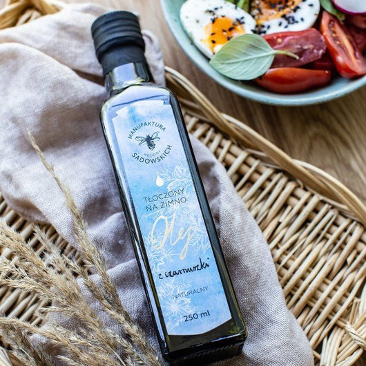 Cold-pressed nigella oil is distinguished by its intense flavour and wealth of valuable nutrients, including Omega unsaturated fatty acids. It is produced from carefully selected cumin seeds, which undergo cold-pressing to preserve their full properties. As a result, the oil is natural, unrefined and full of characteristic aroma. Its intense flavour goes well with salads, sauces and other cold dishes, enriching them with unique notes.