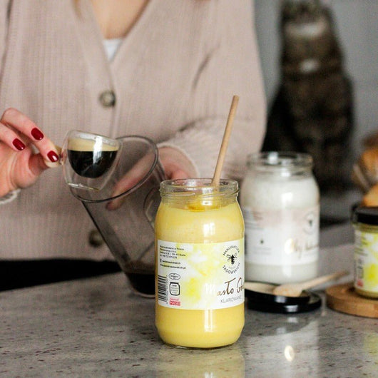 Clarified butter, made in the traditional way in a long and slow process taken from an Indian recipe. Made from the milk of Polish cows, grazed on Bieszczady pastures. Clarified butter is ideal for frying - it has a high smoke point of 260 degrees Celsius.