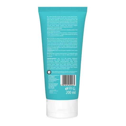 The body emulsion is the ideal combination of care and protection against UVA and UVB rays thanks to photostable filters that do not leave white marks and don't weigh down the skin. Cocoa butter and buriti oil are responsible for intensive hydration and nourishment. The contents of sea buckthorn extract and sea plankton protect the skin against free radicals. In addition, hyaluronic acid, panthenol and squalane take care of its regeneration, soothing and long-lasting hydration.