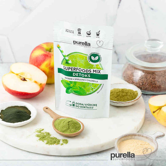 Superfoods Mix Detox was created to help you provide your body with valuable ingredients on a daily basis. Superfoods Mix Detox is a combination of a cluster of "green" powdered superfoods that support the body's cleansing process. Just one teaspoon of the mix added to a smoothie, oatmeal or beverage will have a beneficial effect.