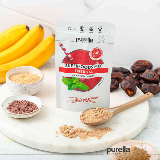 Superfoods Mix Energy Maca, Acai, Guarana has a stimulating effect thanks to guarana, which helps maintain physical and mental vitality, and maca, which helps maintain natural sexual activity and energy.